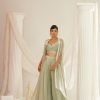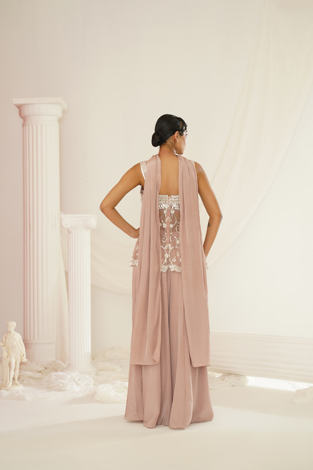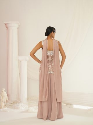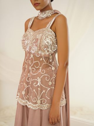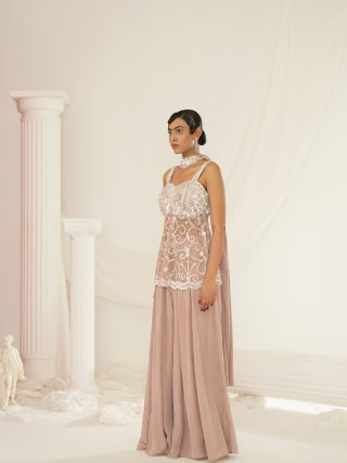 Kapda Dori’s stunning mauve sharara set. The mauve color adds a touch of glamour and sophistication to your look, while the soft geogratte fabric ensures you feel comfortable all day or night long. It is styled with a mauve net peplum which is fully embroidered with pearls,cutdana, beads, stones and sequins and pair with compliementing chokar embroidered dupatta.