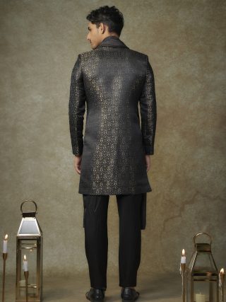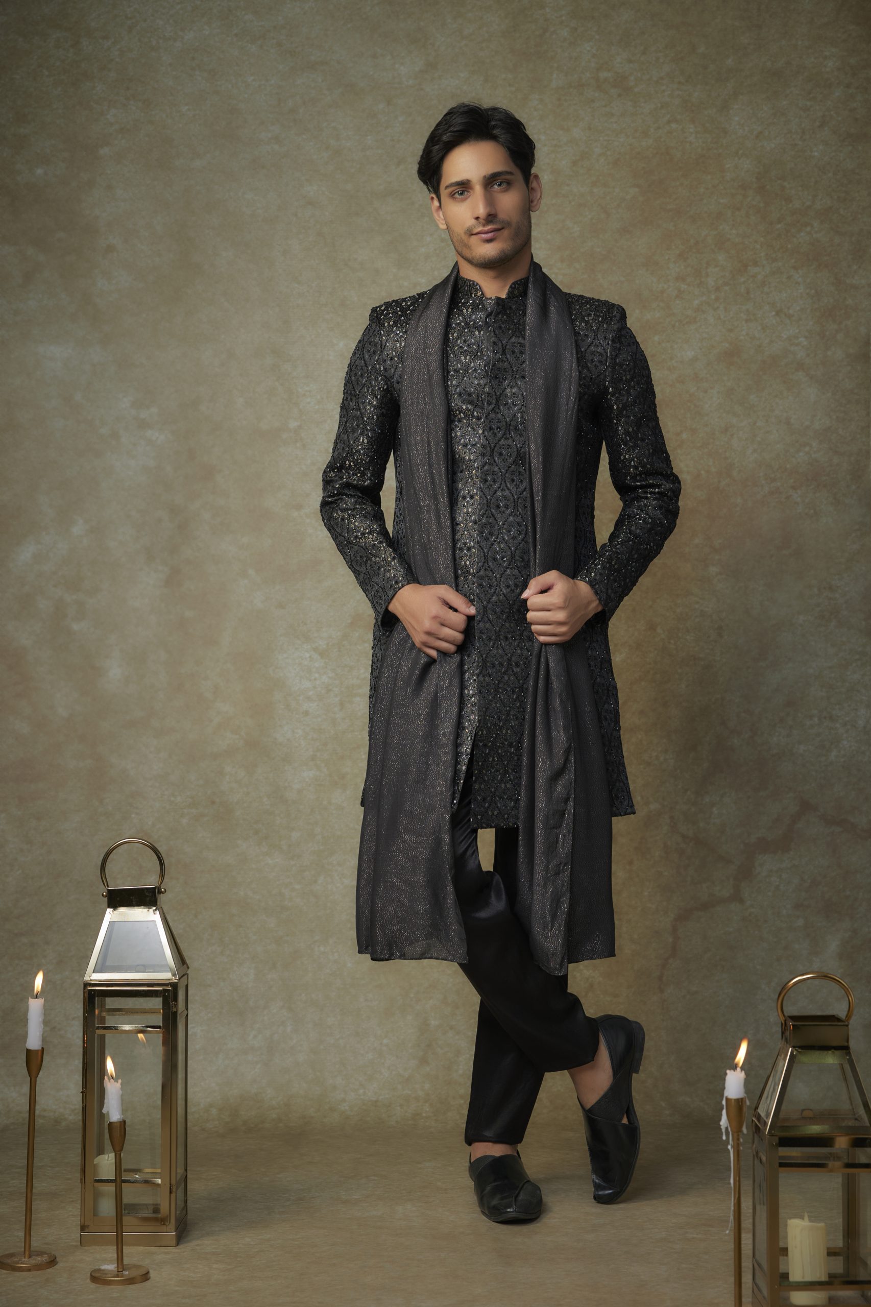 Black embroiderd sherwani with pant and dupatta.