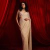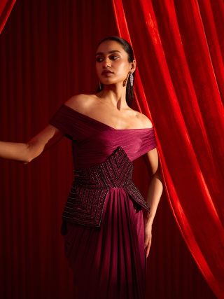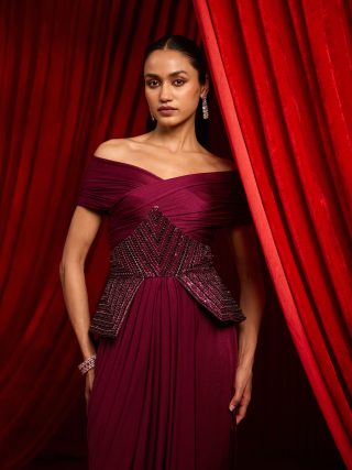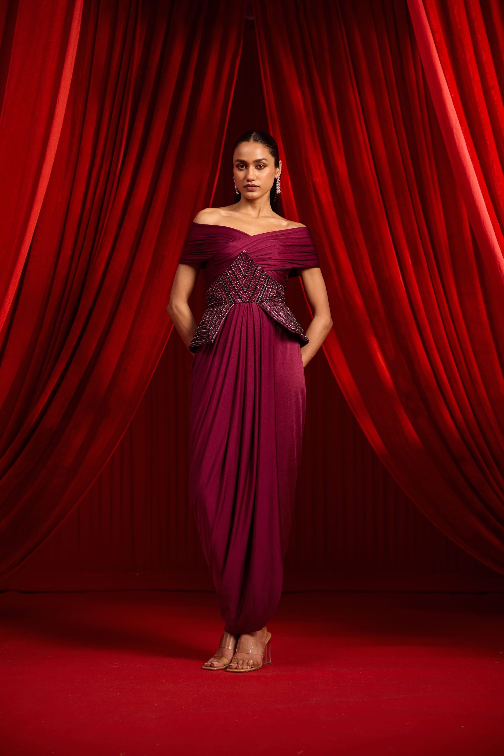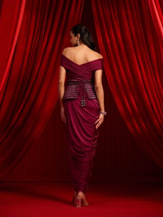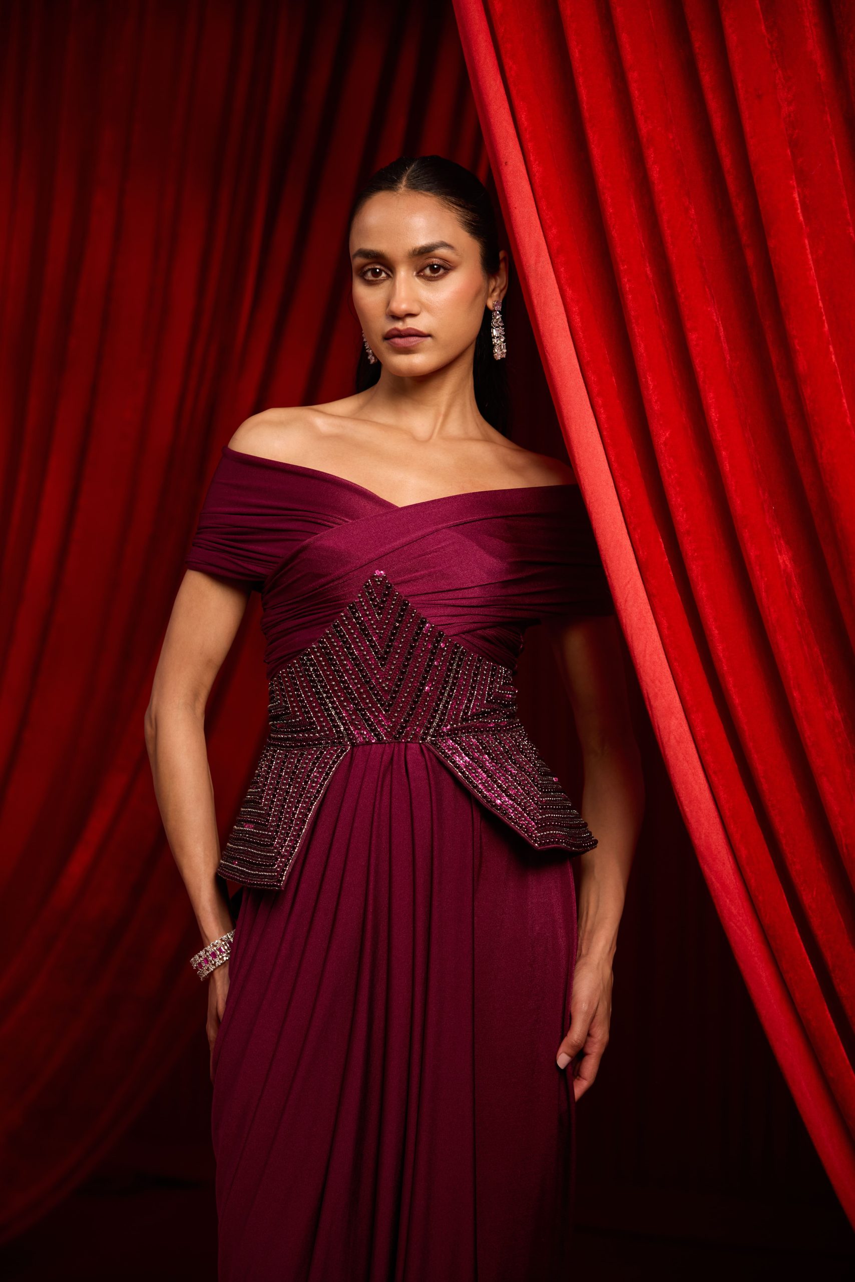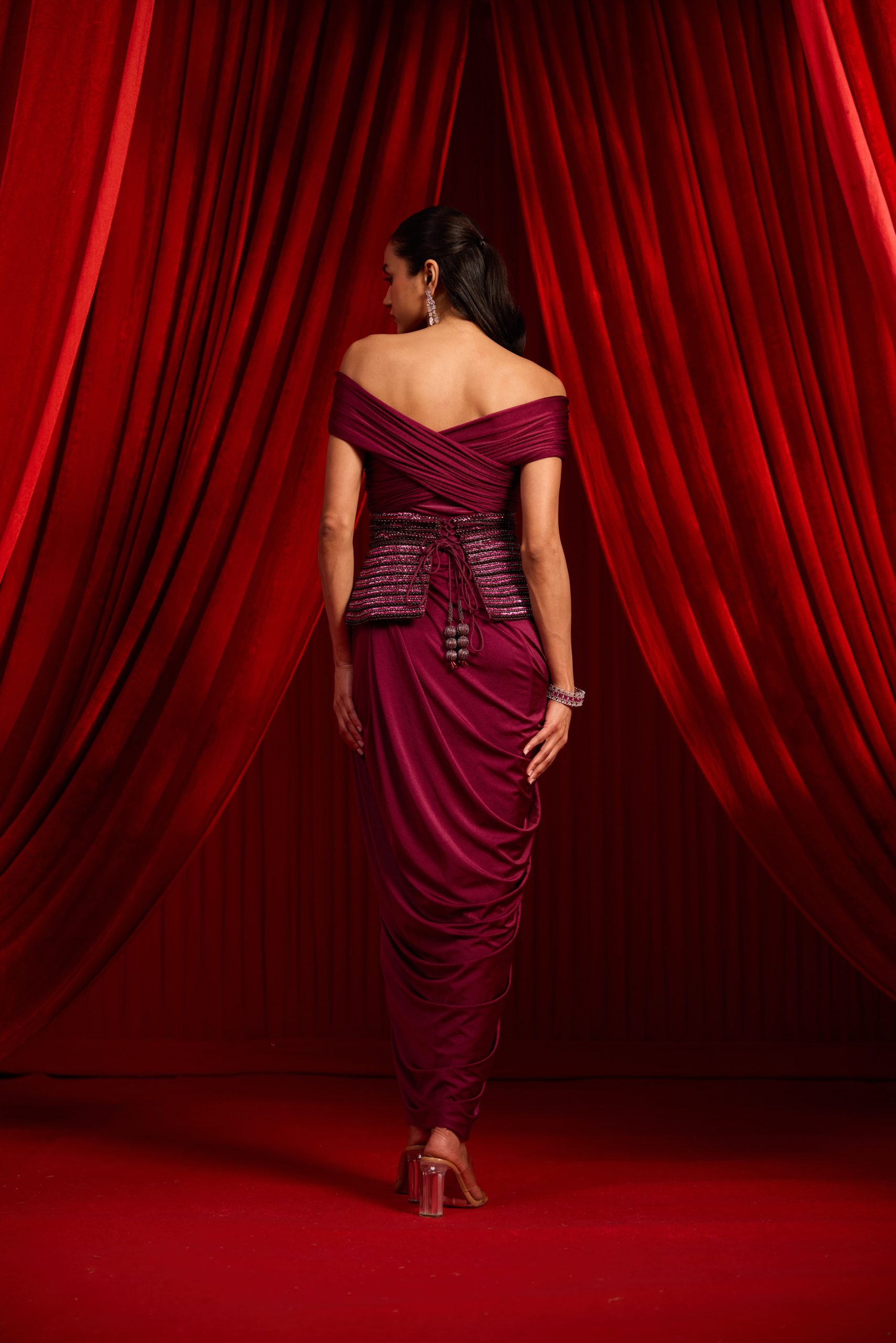 A bold wine ensemble featuring an off-shoulder draped bodice that elegantly wraps across the neckline. The structured corset waist is intricately embellished with geometric mirror and bead detailing, creating a sculpted silhouette. Finished with a fluid pre-draped skirt, this statement piece is perfect for cocktail evenings and glamorous celebrations