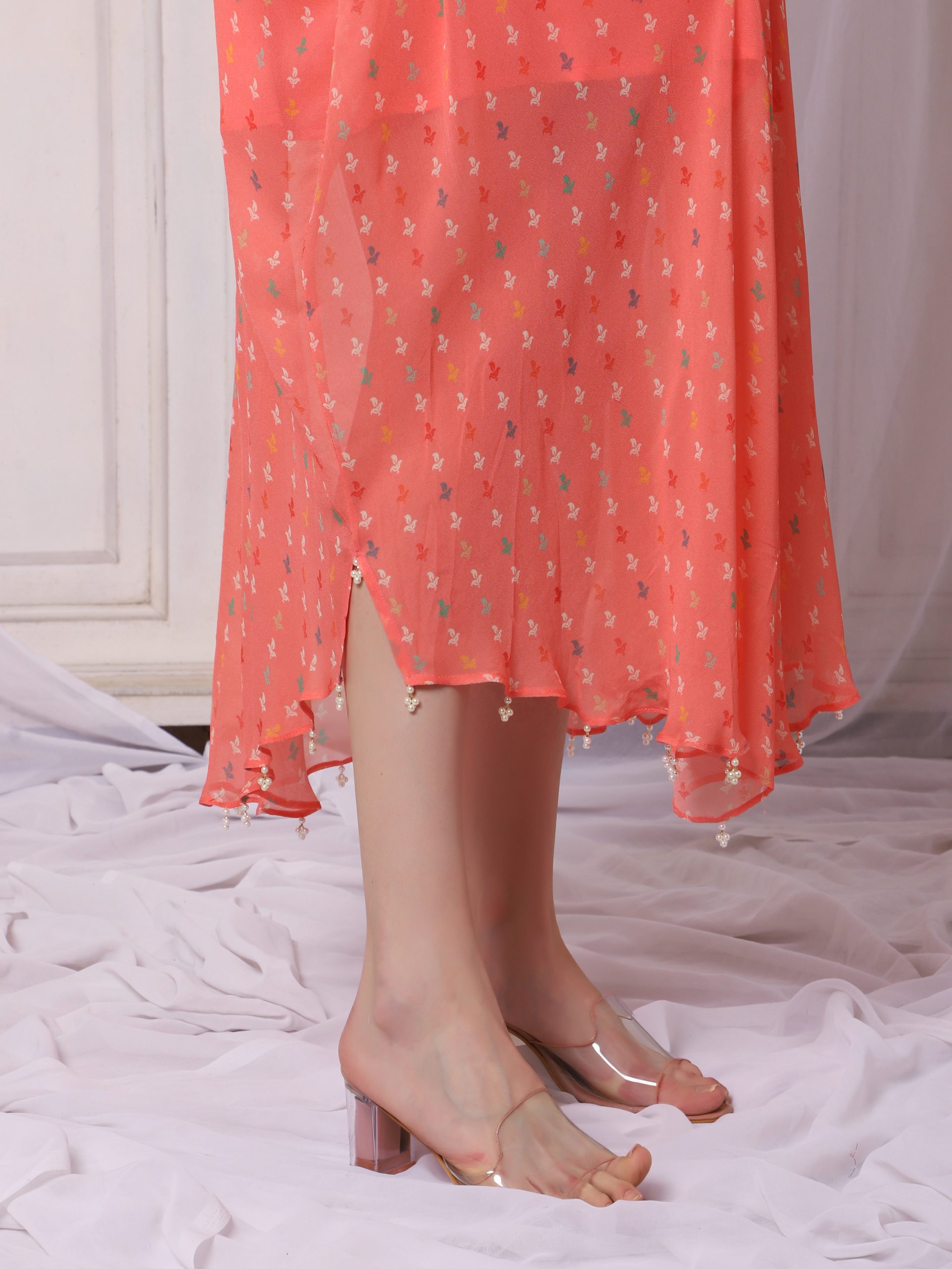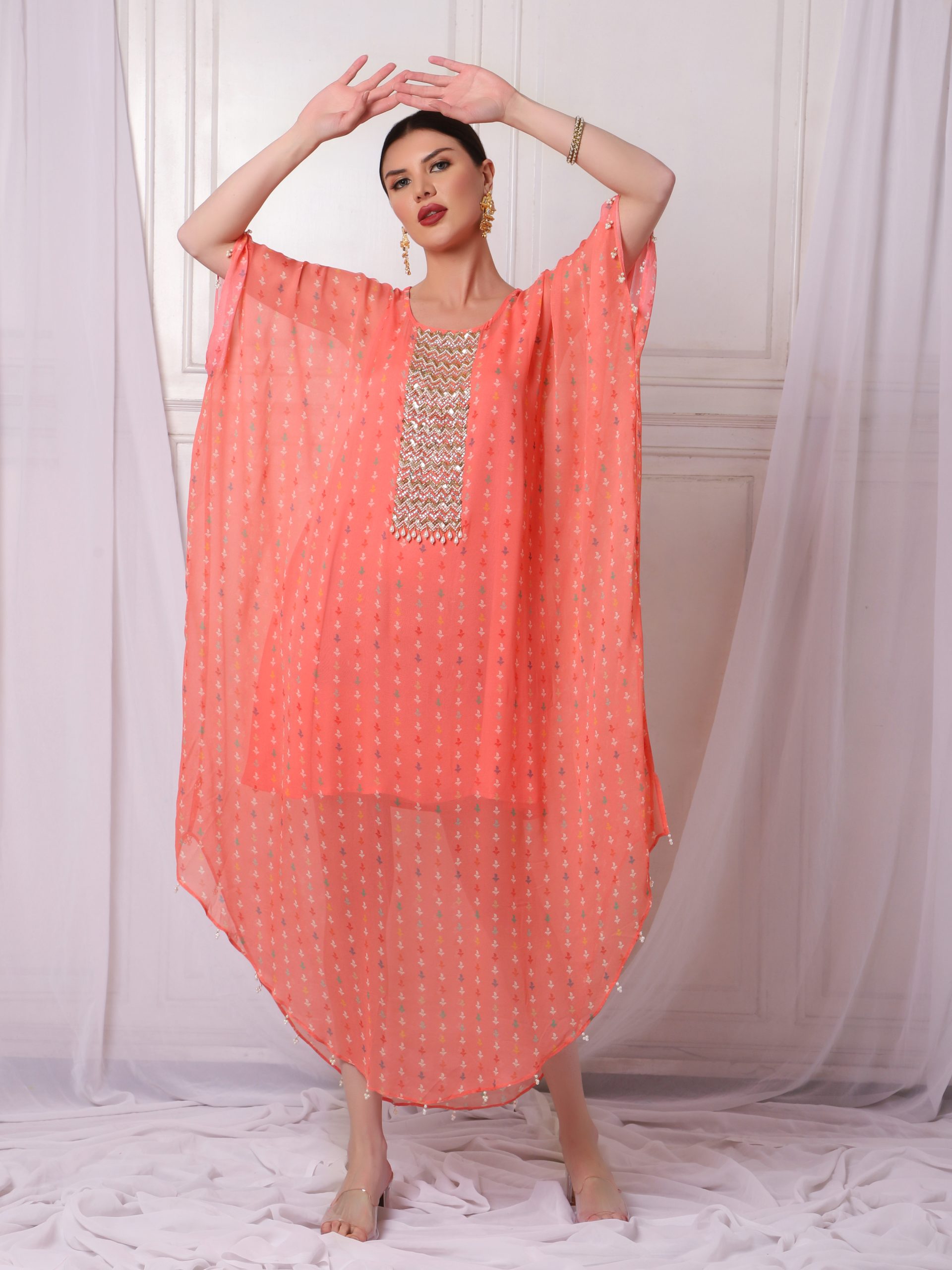 Pink printed georgette kaftan comes with a shantoon inner. The yoke is embroidered using stones ,beads, sequins and pearls.