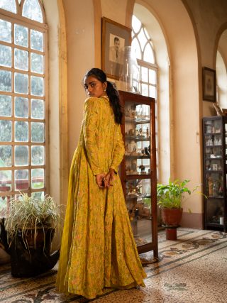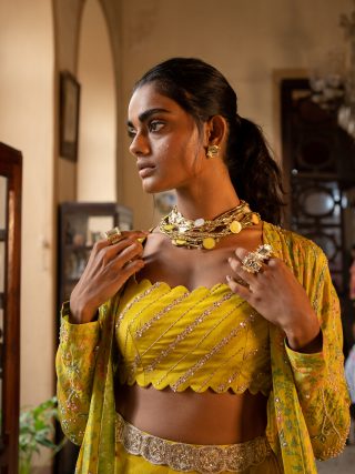 A 16 kali jacket set in our signature print consisting of a scallop detailed blouse and pants, and a jacket that is heavily highlighted using antique tone sequins.